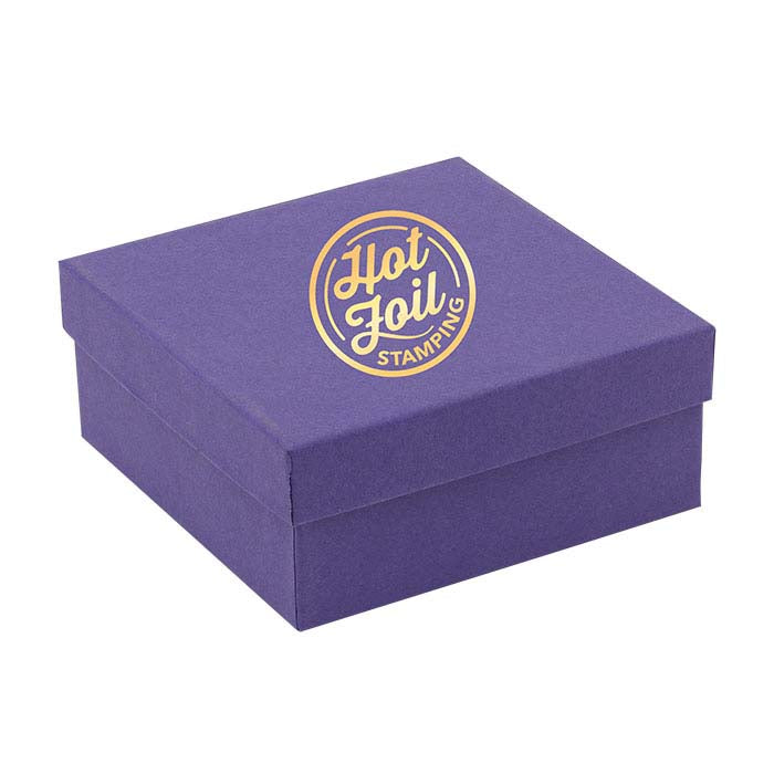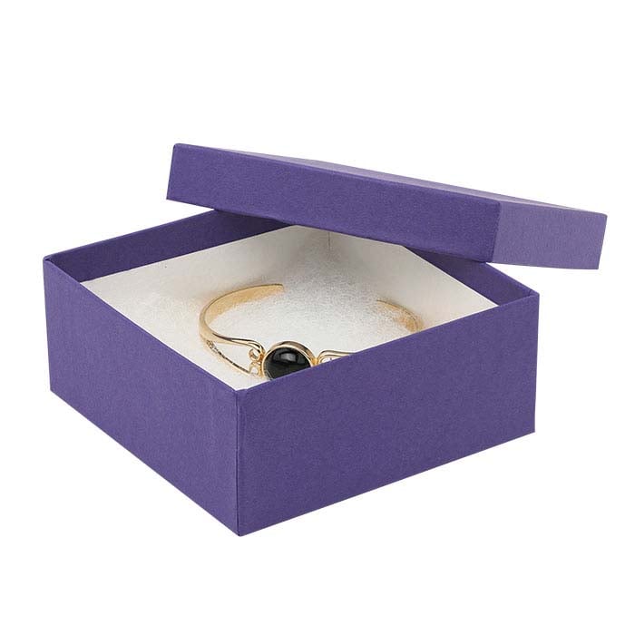 This paper-covered, two-part universal box accommodates a variety of jewelry styles. Use the box as-is, or mix & match it with solid-color cardboard boxes to create color combinations to suit your brand, for seasonal packaging, or for special occasions. Add a decorative ribbon, gift wrapping, or bow (available separately) to customize each box. Purple recycled paper (100% post-consumer fiber) covers the 100% recycled cardboard box (made with 90% post-consumer fiber and 10% pre-consumer fiber); the box includes a 1/2"-thick white poly-fill wadding that will not cause tarnish.Hot stamp your gift box with your company name or logo, keeping you top-of-mind long after the jewelry sale.