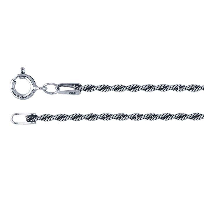 This sterling silver twist rope chain is oxidized to enhance the subtle details of the chain links and works well with a variety of designs. It looks great when worn as is, but can also be enhanced with your customer’s choice pendant for a personalized look.French rope chain features a double row of twisted links that are interconnected, producing a substantial chain with an obvious spiral, as if two rope chains were entwined.