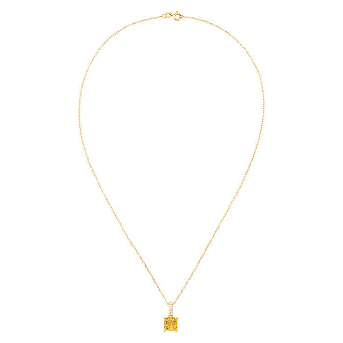 This finished 10-karat yellow gold necklace features a pendant that is set with one 7mm princess-cut citrine faceted gemstone and the bail is accented with several round white diamonds (I3 clarity/H–I color; 0.053CTTW). The necklace is completed with a spring ring clasp.