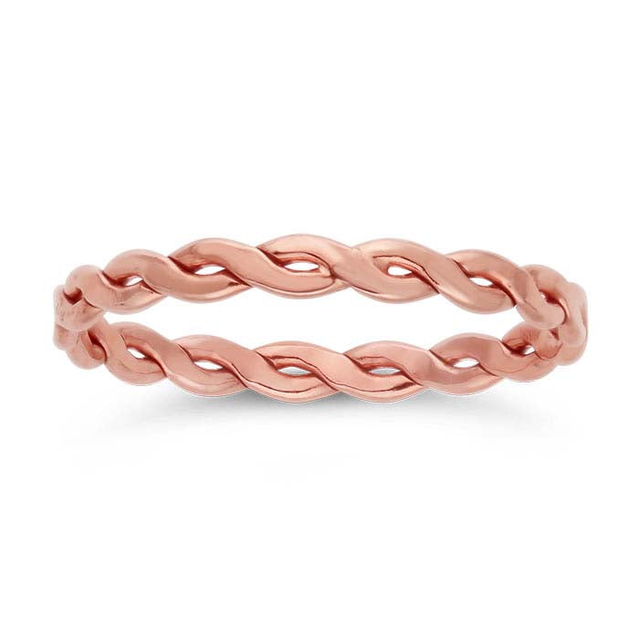 This 14/20 rose gold-filled ring is made from flattened wire that is woven into a braided design. Offer a wide selection of stackable rings that customers can choose from to create an individual, changeable look. This ring is plated with 14-karat rose gold to ensure a uniform color.