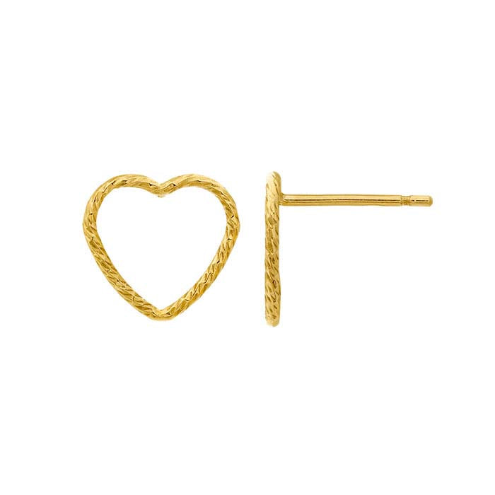 This 14/20 yellow gold-filled post earring features an open 10mm heart made from round sparkle wire. The earring is lightweight and comfortable to wear; offer them as-is or add drops or dangles for a more complex look. The friction post features a groove that helps provide the most secure and comfortable fit. This earring is plated with 14-karat yellow gold to ensure a uniform color.