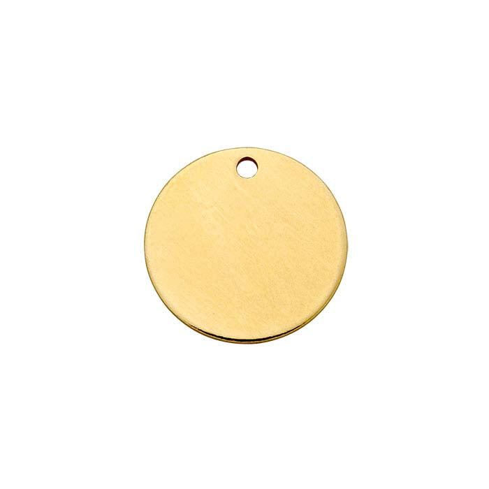 Attach this 14/20 yellow gold-filled double-clad round quality tag (sometimes called a design or jewelry tag) to let your customers know what is special about your design; stamp or lightly engrave information such as the purity of the metal, country of origin ("Made in the USA"), or your logo or signature design. For a different look, engrave this tag deeply to create a two-tone look once you form the stamping as desired. The tag is die struck with clean, crisp edges and will require some finishing to smooth its edges and polish its surface.This tag is soft; it may arrive slightly domed and will be easy to shape as desired.