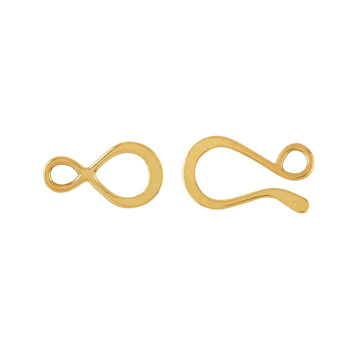 This 14-karat yellow-gold hook & eye clasp features a flattened profile and a smooth, bright finish. Hook & eye clasps are two part clasps that close by hooking one side (the hook) to a large closed ring (the eye). They tend to be larger than other clasp types and are ideal for larger designs, bead strands or bib-style necklaces. The open hook relies on the necklace having enough weight to keep the clasp secure.