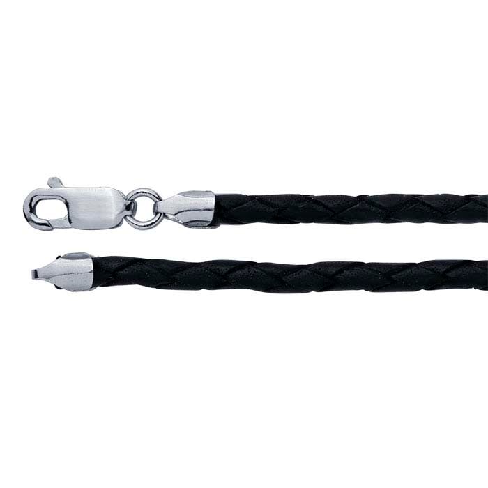 This braided black leather cord necklace has a smooth finish and is a classic backdrop for your designs. It can be worn alone or used to showcase a special pendant or drop. Give your customers the option to customize the design by offering pendants, charms or drops they can choose from to personalize their necklace. The necklace is finished with a sterling silver clasp and end caps. Rhodium-plating provides a durable, tarnish-resistant finish to the clasp.