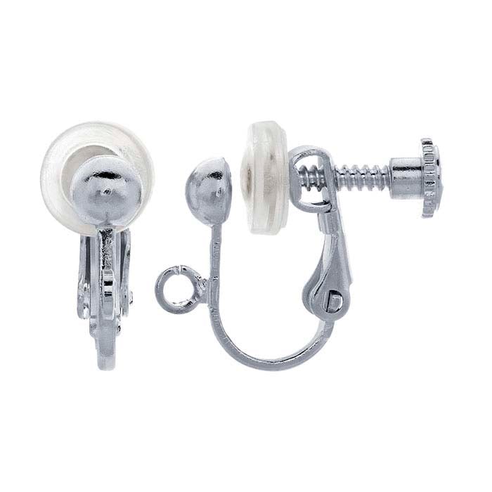 Perfect for unpierced ears, this silver-plated brass screw-back earring features a half-ball accent and an open ring for attaching a drop or dangle. The screw-back is finished with a 4.5mm silicone cushion, providing maximum adjustability along with a comfortable fit. Once the wearer adjusts the screw to achieve the perfect fit, a hinge provides easy on/easy off wear.