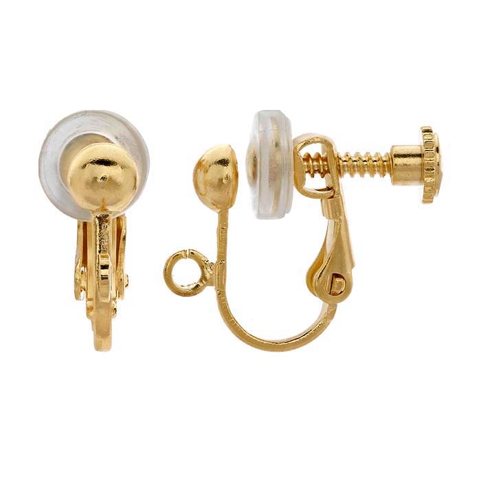 Perfect for unpierced ears, this yellow gold-plated brass screw-back earring features a half-ball accent and an open ring for attaching a drop or dangle. The screw-back is finished with a 4.5mm silicone cushion, providing maximum adjustability along with a comfortable fit. Once the wearer adjusts the screw to achieve the perfect fit, a hinge provides easy on/easy off wear.