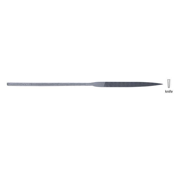 This Friedrich Dick knife escapement file is ideal for your most delicate filing and shaping tasks, for smoothing tiny details, and for creating inside cuts. Use this file for accessing narrow openings, angled joints and small features such as prongs. It has flat sides and edges with one edge thicker than the other so that the sides angle inward. With teeth on both sides and on the narrow edge, this double-cut file tapers to a fine point. The smooth wider edge helps protect set stones and adjacent structures against incidental contact with cutting surfaces.This file has a German cut #5; German-cut files are graded by the number of teeth, counting teeth parallel to the long axis of the file. German cuts start coarser than Swiss and go finer, offering more increments for more precise cutting. In all cut styles, the higher the number, the finer its cut.A double-cut file features two sets of evenly spaced teeth set in two directions, one at a slightly different angle than the other. Double-cut files are designed to cut more aggressively, maximizing the work of each stroke to remove more metal with fewer strokes. At the end of the stroke, the file should be lifted from the workpiece and repositioned for the next stroke; dragging the file backward against the metal can mar the metal and damage the teeth.Escapement files are narrower and thinner than standard needle files with shorter cutting surfaces and longer, square handles. Effective on gold, silver, platinum, titanium, steel and other metals, escapement files are best suited for work that requires little metal removal.Among the finest jewelers' files in the world, Friedrich Dick files are made of tough chrome/tool steel alloy and precisely machined to yield sharp corners and fine points. These files have deep-cut teeth that provide efficient, uniform stock removal and are 66–67 HRC hardness for exceptional service with minimal care.