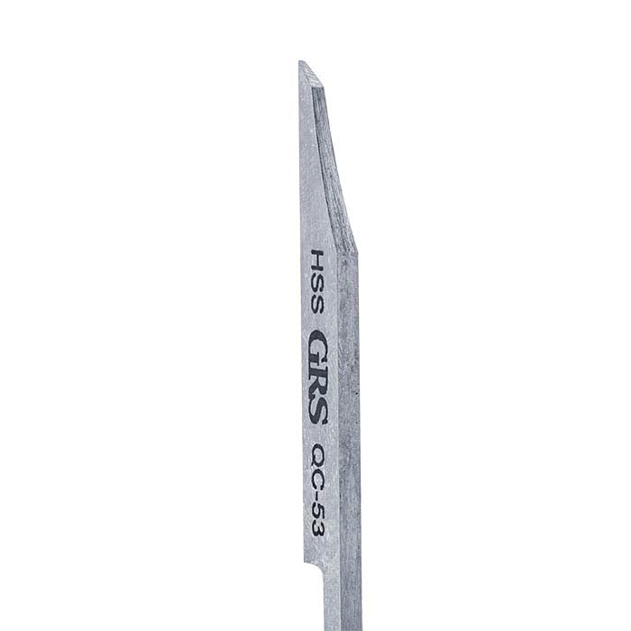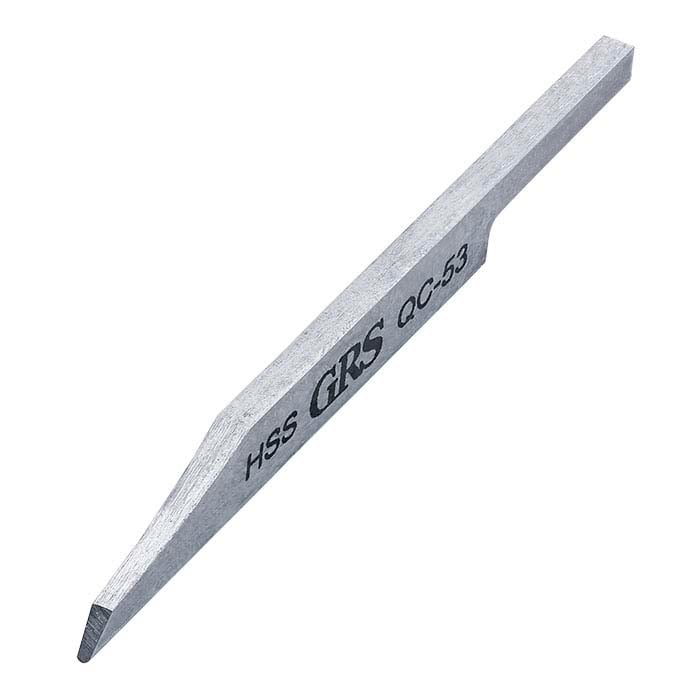 This shortened QC-53 (0.8mm 0.0.31”) round graver from GRS® is ideal for use with quick-change holders and other handpieces. It has tapered sides and a rounded cutting edge. The graver is commonly used for bead raising, block lettering, line engraving, and engraving uneven surfaces. Use with 1/8” QC tool holder. Made of high-speed chrome steel, GRS® quick-change gravers are durable and hold a sharp cutting edge; they are easy to reshape and resharpen.