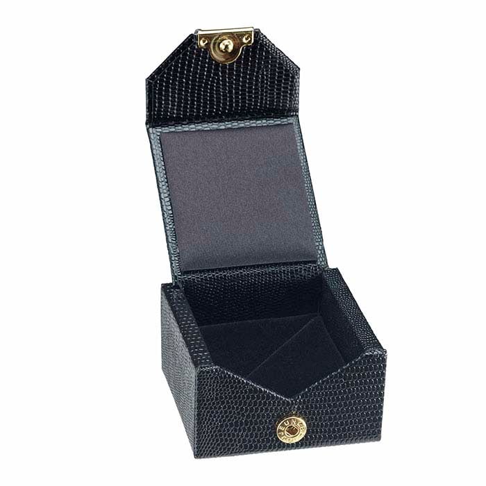 This High Desert™ faux-leather box accommodates a single ring. Add a decorative ribbon, gift wrapping or bow (available separately) to customize the box. Black, faux-leather Skivertex® material with a genuine snakeskin leather look and feel covers the sturdy cardboard box; black satin lines the box lid; matching-color flocking covers the die-cut foam insert. A gold-color metal snap secures the box. Each box is delivered in a protective cardboard sleeve.