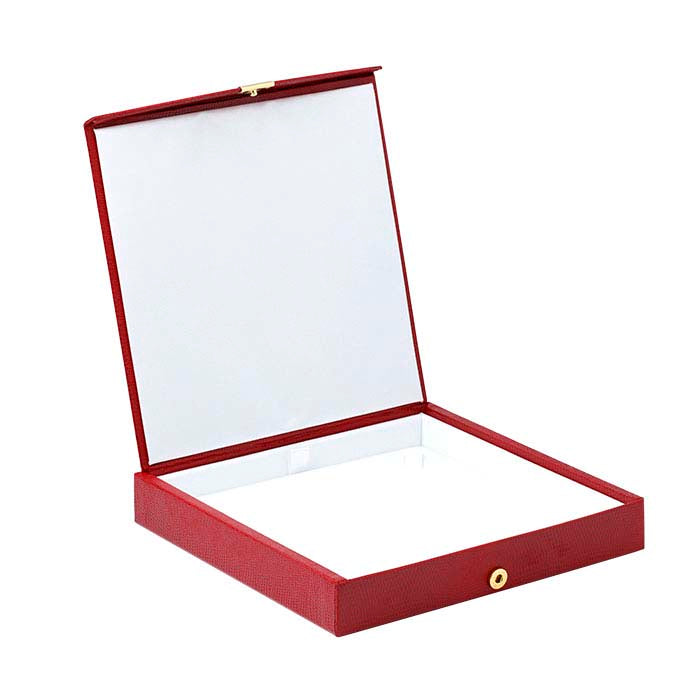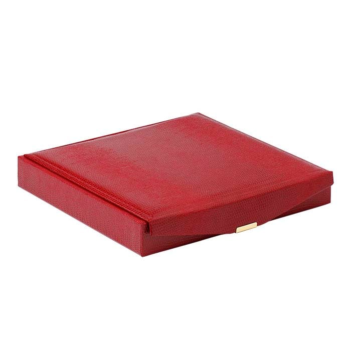 This High Desert™ faux-leather gift box accommodates a necklace. Add a decorative ribbon, gift wrapping or bow (available separately) to customize the box. Red, faux-leather Skivertex® material with a genuine snakeskin leather look and feel covers the sturdy cardboard box; white satin lines the box lid; matching-color flocking covers the contoured insert. A gold-color metal snap secures the box. Each box is delivered in a protective cardboard sleeve.