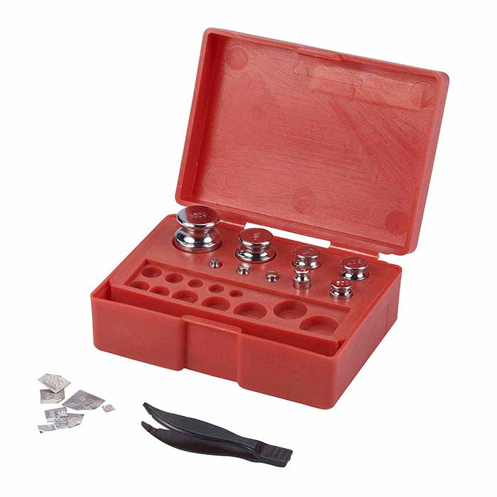 • 17 weights: 100g (1), 50g (1), 20g (2), 10g (1), 5g (1), 2g (2), 1g (1), 500mg (1), 200mg (1), 100mg (2), 50mg (1), 20mg (2) and 10mg (1)