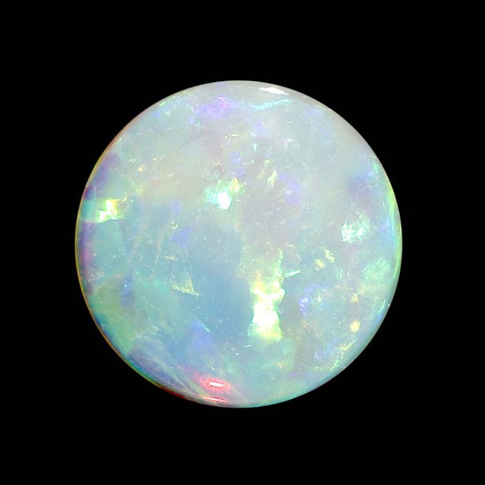 This natural round opal cabochon is an appealing option for custom jewelry and one-of-a-kind pieces. To bring out the opal's signature flashing colors, it is recommended that you set the gemstone over a black or dark-colored layer, or that you heavily oxidize your metal. Opal is the birthstone for October.Opal is a relatively soft mineral that comprises silicon and water and is characterized by and valued for its display of flashing rainbow colors, referred to as the "play-of-color." There are many different varieties, with gemstone colors ranging from white or light gray to brown or red to black. While opal may be found in either sedimentary deposits or in volcanic deposits; the volcanic gemstones tend to be brittle and more fragile than the sedimentary gems.