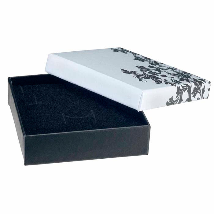 This two-part Soft Touch™ paper-covered combination box accommodates a ring, earrings and/or a pendant or chain, making it ideal for coordinated sets. Add a decorative ribbon, gift wrapping or bow (available separately) to customize the box. Smooth, silky-feeling matte black Soft Touch™ paper that invites touch covers the base of the sturdy cardboard box; white paper with a contrasting Gothic floral pattern covers the box lid. A black, die-cut flocked foam insert is included. Hot stamp your gift box with your company name or logo, keeping you top-of-mind long after the jewelry sale.