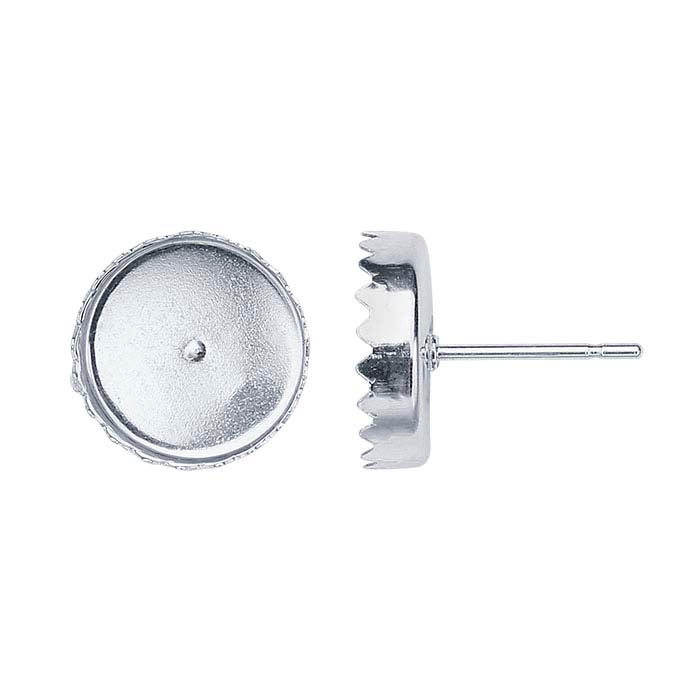This sterling silver earring post features a 10mm round bezel mounting with a decorative, serrated edge. Set with one cabochon using traditional bezel setting techniques. For additional security, add jeweler's epoxy to the bottom of the cup before placing your stone. The friction post features a single groove to help secure the ear nut (not included).