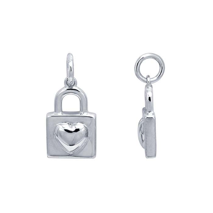 This sterling silver charm features a square padlock with a raised heart in the center. Use it as the centerpiece of a cord or chain necklace, or combine it with a variety of charms, components or beads in more complex designs. It is plated with rhodium to ensure a durable, tarnish-resistant finish. This charm includes a jump ring.