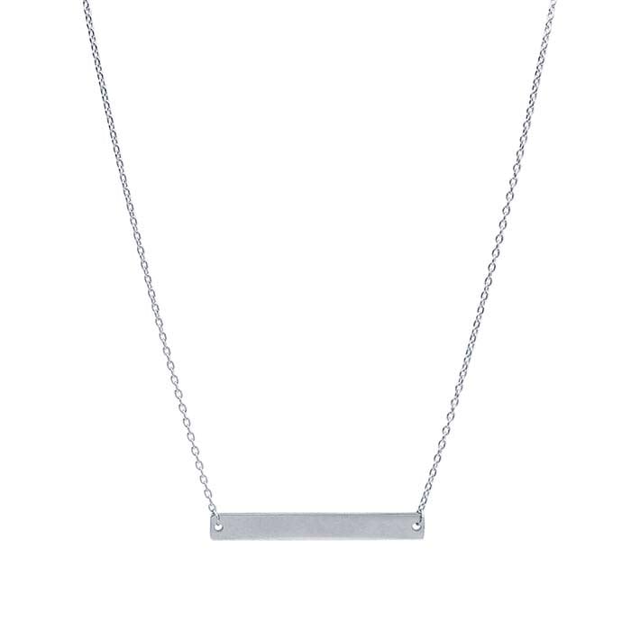 This 14-karat white gold necklace features a 30 x 4mm rectangle bar festoon pendant on an oval cable chain and is ideal for personalizing with engraving or stamping. The 1" chain extender allows the wearer to adjust the necklace's length from 17" to 18". Pendant presents a smooth, bright finish. This necklace is plated with 14-karat white gold to ensure a uniform color. This necklace is plated with rhodium to ensure a durable, tarnish-resistant finish.