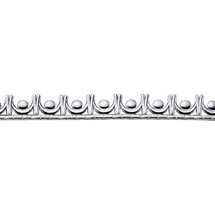 This intricate Argentium® Silver "swag" gallery wire features an open, filigree look and is ideal for creating custom bezels and for adding decorative elements to a wide variety of jewelry designs. The wire is delicate and should be handled with care. Hard Argentium® Silver gallery wire is significantly work-hardened and, though it does not bend readily, it stubbornly holds its shape after forming; it is ideal for clasps and hinges. Keep in mind that hardness is changeable (by annealing or heat-hardening) and is relative among metal types (each temper will feel and handle differently from one metal to another). When finishing your pieces, also keep in mind that the harder the metal is, the brighter a finish it will take. This wire is packaged in coils and can be cut to any length that satisfies the system minimum. Orders must weigh at least 0.01 ozt.; if you click 'Add to Cart' for a quantity less than this, the cart will offer a prompt to let you know what the minimum for this item is. This gallery wire is manufactured by Rio Grande. Made with a touch of germanium, Argentium® Silver presents a bright white color that is closer to fine silver than traditional sterling, yet is highly resistant to firescale and less likely to tarnish under most conditions. It welds flawlessly and is ideal for fusing techniques. All Argentium is guaranteed by Argentium International Ltd. Your customers will appreciate the value and convenience of brighter-white sterling silver designs that resist tarnishing and keep on shining. Working with Argentium Silver® is a bit different than working with traditional sterling. If you are new to using Argentium®, scroll down or visit our Resource Center (see tab above); you'll find lots of help and guidance to help you reap all the benefits this material has to offer! Manufactured to exacting quality standards in our solar-powered facility.