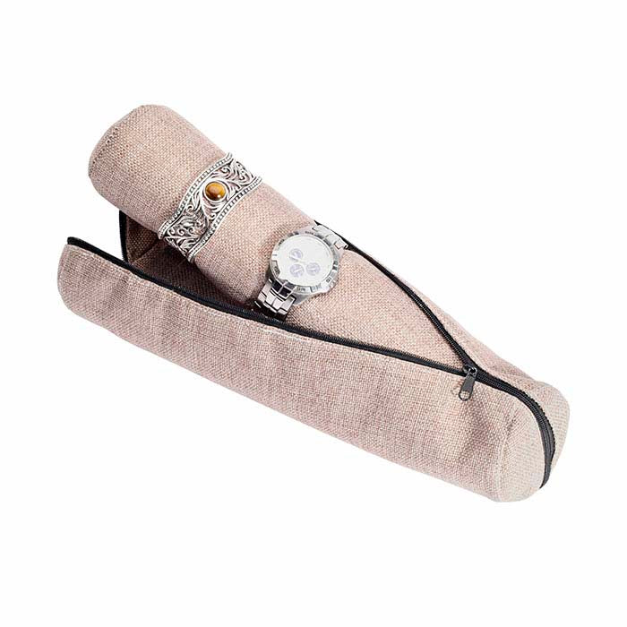 This jewelry roll is ideal for transporting and displaying a variety of watch and bracelet styles. To use, simply remove the zippered travel back and use the foam tube to display your jewelry. Burlap covers the travel bag and soft foam tube .