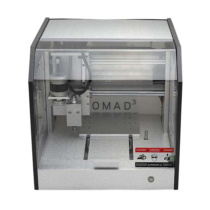 Get to work right out of the box with this complete CNC mill package. It includes the Carbide3D Nomad 3 CNC mill with gray side panels and additional accessories that expand its capabilities: a BitZero V2 work probe, threaded fixturing table, a low-profile jig, and a flip jig.Render your computer-generated jewelry designs with incredible, intricate detail and surprising speed with the Nomad 3 CNC mill from Carbide3D. This desktop machine delivers high-resolution milling in a space-conscious footprint that easily fits into almost any studio or workspace. It comes out of the box complete with the software and all the materials you need to get right to work. Made in the USA.The 130W spindle motor provides up to 24,000rpm—more than double its predecessor—allowing the mill to quickly cut through material and increase your production. Specifically designed for the Nomad 3, the rigid spindle delivers smooth, reliable performance, and durable construction for a long service life and quiet operation; its ER-11 collet holds 1/8"-shank tools. The cutting tools cleanly carve soft metal and easily handle hard waxes and modeling materials.