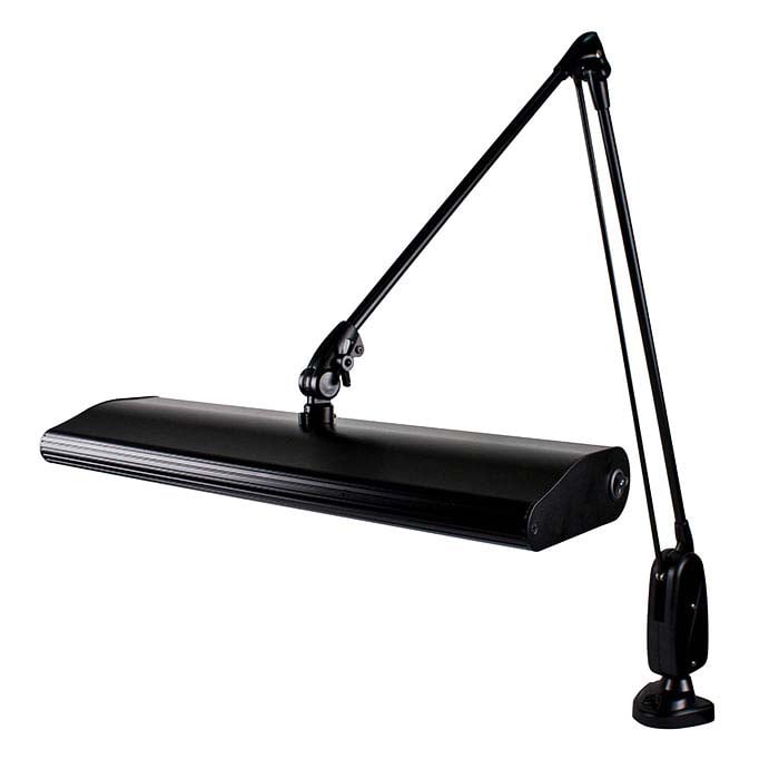 This premium-quality metal lamp is enamel-finished and has fully adjustable 43" floating arms for convenient positioning. The universal clamp-on base has a 2" opening and clamps onto any vertical, horizontal or slanted surface. Includes two standard cool-white (6500K) 15-watt, 18" fluorescent tube bulbs and a 7-ft. cord with a three–prong grounded plug. UL approved. Lamp includes a manufacturer's two-year electrical warranty and five year mechanical warranty.