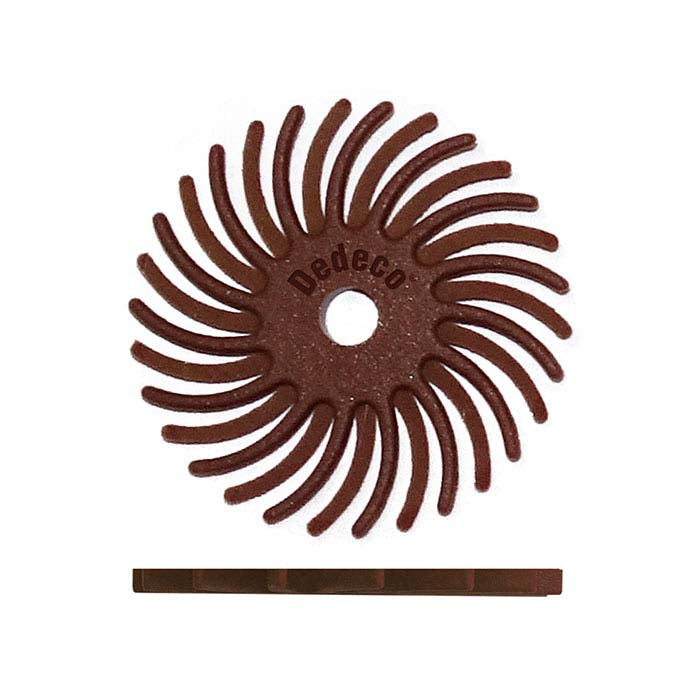 Dedeco® Sunburst® radial discs are impregnated with an aluminum oxide abrasive that delivers faster results and a longer life than rubber wheels. They produce minimal heat and dust, and require no polishing compound.