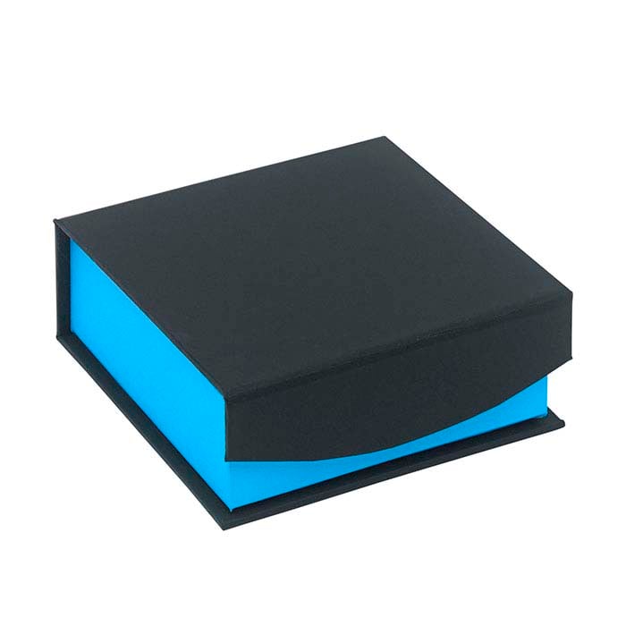 This "Electric Night" bright blue and black combination box accommodates one pendant, one ring and/or one pair of earrings, making it ideal for matched sets. The vibrant, two-tone color scheme and curved-front magnetic flap closure give the box an eye-catching, high-end look. Add a decorative ribbon, gift wrapping or bow (available separately) to customize the box. Smooth paper with a faux-leather look and feel covers the plastic box; the top and bottom of the box are covered with black paper; the sides are covered with bright blue paper. Black paper covers the inside of the lid; black velvet lines the interior sides of the box. The insert is die-cut and covered in black flocking.