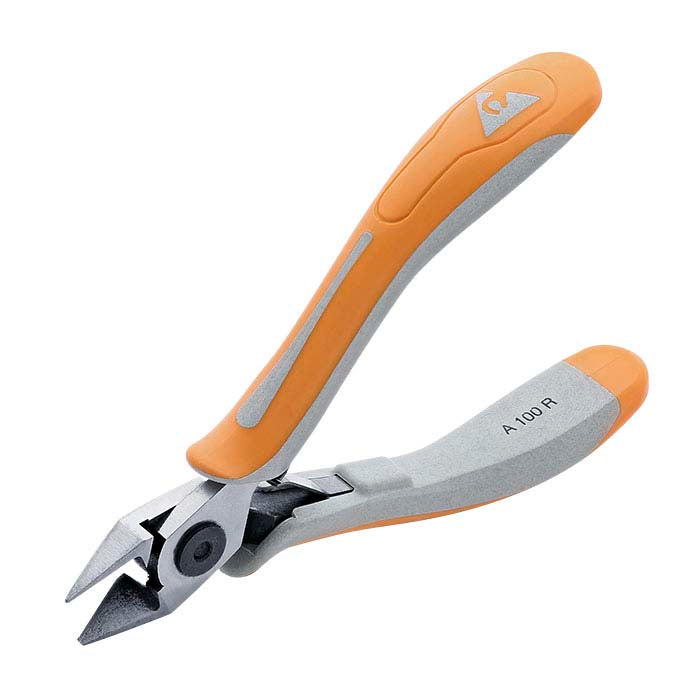 Cut with a laser, the jaws on these Italtec tapered-head flush cutters feature sharp, precision edges that provide crisp, repeatable cuts; the tapered head shape provides improved access to fine details or close work areas. Flush cutters leave a minimal pinch. Cutters with a tapered head provide better reach into tight areas; protect the tips against damage by cutting at the center of the jaw. The jaws are made of C70 steel hardened to 62 HRC; the jaws will not be nicked with normal use and tend to keep their shape. Clean with Cosmoline® or a similar protectant; avoid contact with moisture.