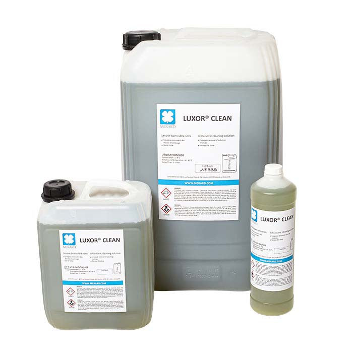 Luxor® Clean by Merard is designed for use in ultrasonic cleaners to eliminate all polishing paste residuals—even on the most complex pieces—without tarnishing precious metals or leaving oxidation stains. This efficient solution dilutes immediately, cleans in 2-4 minutes and extends bath longevity. Although Luxor Clean is optimized for Merard products, it also eliminates residuals from other polishing compounds.