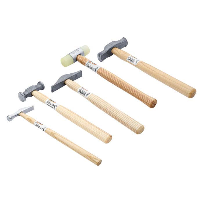 Accomplish a wide variety of metal forming tasks with this five-piece set of Picard forming hammers. Each hammer has a hardened and tempered steel head that ensures a long life and the mallet is made with high-impact white nylon that is ideal for use directly on the metal without leaving unwanted marks on the surface. The handles are crafted from Ash wood and sealed to provide a comfortable grip. The assortment includes: