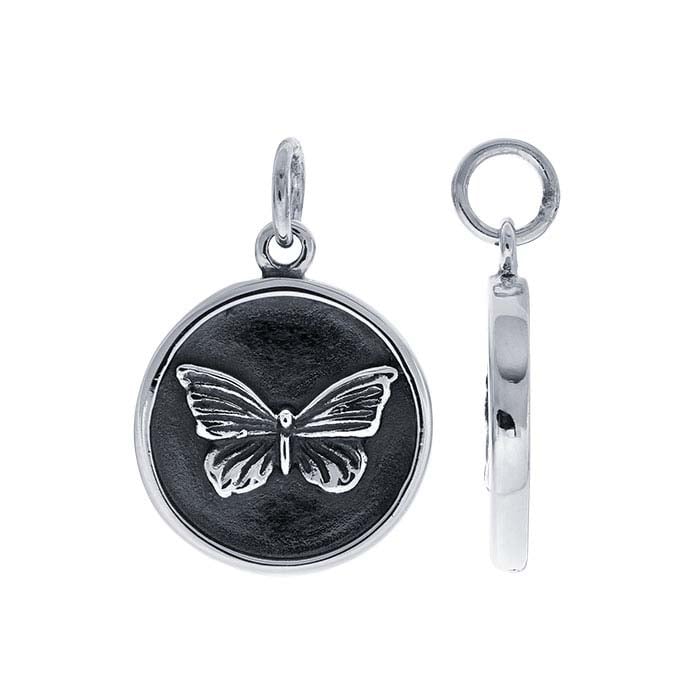 This sterling silver pendant features a round shape with a bright butterfly against a dark, oxidized background. The pendant makes a great addition to a themed design and it works well as a simple drop for a necklace. A jump ring is included.