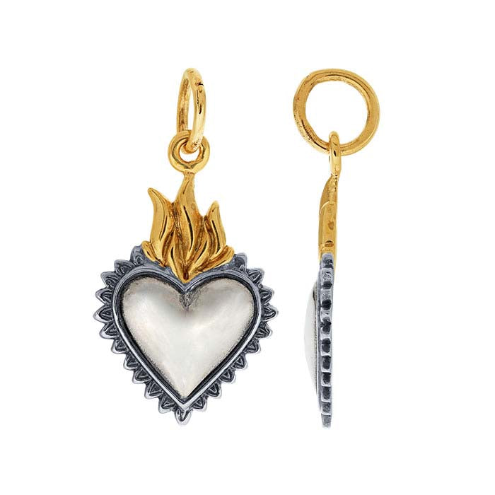 This sterling silver charm features a sacred heart with a bronze flame and closed ring. The two-tone design provides visual depth and makes the charm a great addition to a variety of designs.