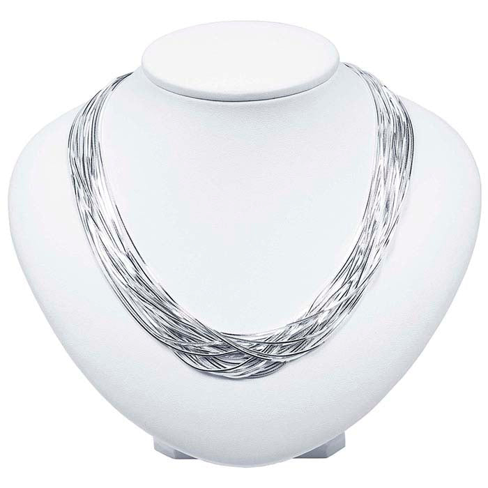 This versatile sterling silver necklace features 20 individual strands of fine square snake chain (0.9mm) gathered into round end caps, giving the necklace a beautiful, light-catching look similar to liquid silver—ideal for elegant occasions. Encourage customers to wear this chain either twisted or untwisted for an easily changeable look. A matching bracelet is also available.