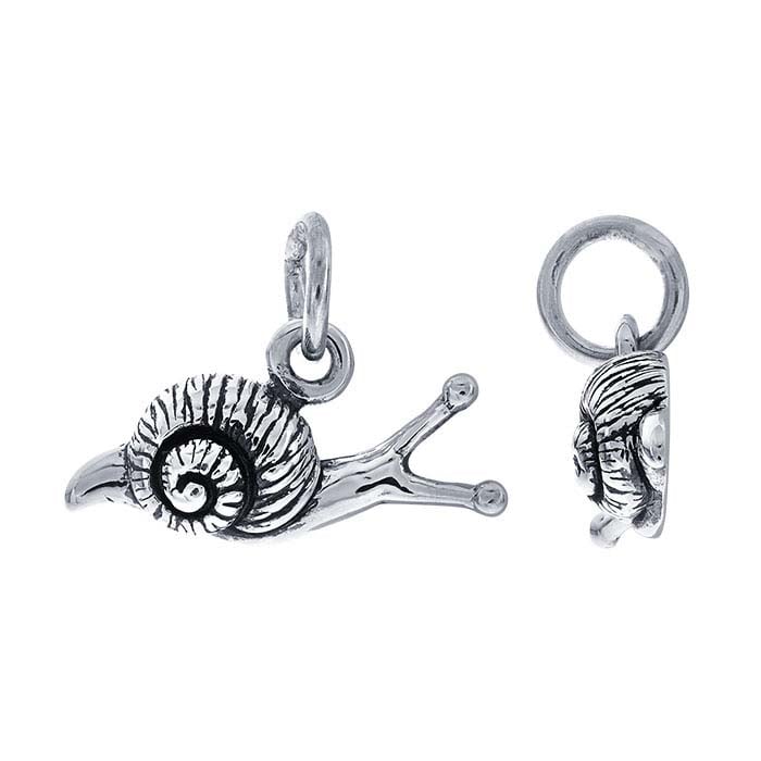 This sterling silver charm features a 3D snail with oxidized details. Create an earring drop or delicate pendant, or add it to more complex necklace and bracelet designs made with chain and cord. A jump ring is included.