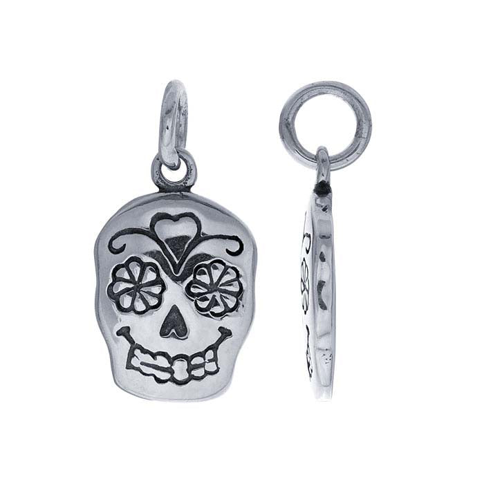 This sterling silver pendant features a flat, sugar skull design and is oxidized highlight the details. The pendant is ideal for creating a simple necklace or use it as one element in a themed design. This pendant includes a jump ring.