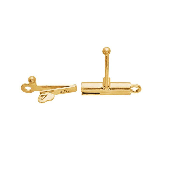 This 14-karat yellow gold safety clasp features a round 9 x 3.2mm barrel shape and a smooth, bright finish. Safety clasps (also called pearl clasps) feature two parts that connect in two different ways, providing a fail-safe that helps prevent loss of higher-value necklaces or strands and are ideal for pearl and gemstone strands. The interior part of the clasp is a slender hook with notches along the outer edge; the exterior part is hollow except for a locking bar. The interior part hooks over the locking bar and then slides inside the exterior part, the notches catching along the inner sides to hold the clasp securely closed. Even if the notches fail for any reason, the hook keeps the strand in place.