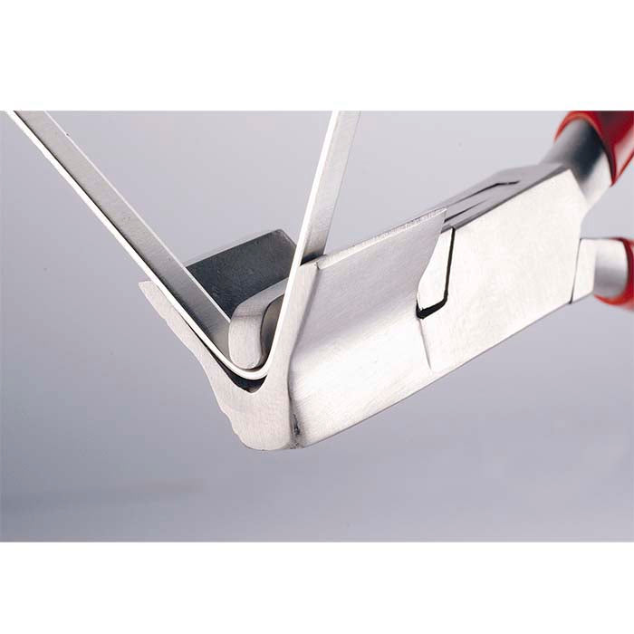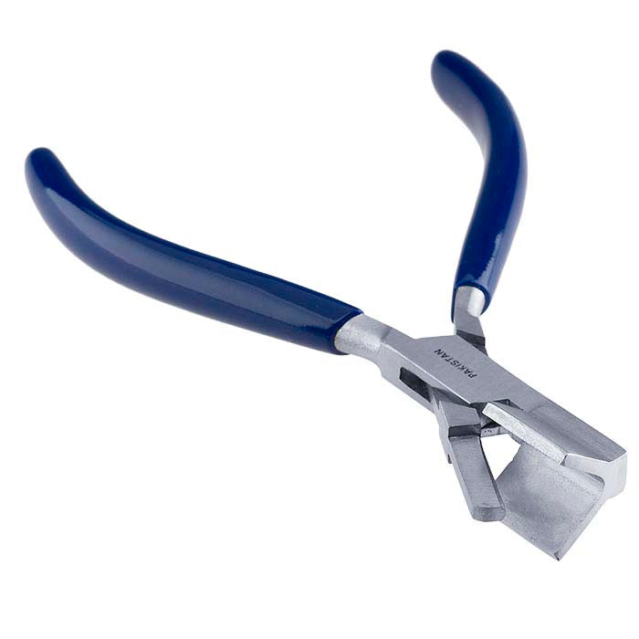 The top jaw of these bending pliers is curved; the bottom jaw is wide, flat and V-grooved—when used on wire or flat stock, they create a round-cornered, 90° angle bend. These pliers are for use on wire up to 10 gauge or stock up to 22 gauge. Forming pliers have a variety of jaw configurations designed to maximize the ability to bend, shape or form wire, strip and sheet. They are ideal for creating ring shanks, opposing curves (waves or corrugation), angles and patterns. These pliers are made of hardened tool steel, a strong material for pliers and cutters; the jaws will not be nicked or deformed with normal use. Clean with Cosmoline® or a similar protectant; avoid contact with moisture.