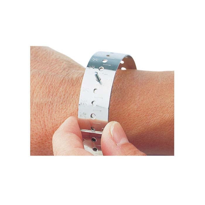 This adjustable bracelet gauge helps quickly and easily fit customers for all types of bracelets; it's especially useful for bangle bracelets. Adjust the gauge to the desired size, then close with the sliding clasp to check the fit over the wearer’s hand. The gauge measures the bracelet circumference in quarter-inch increments from 5" to 9".