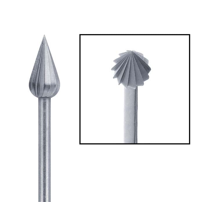 This AdvantEdge 6mm flame wax bur has wide fluting that helps keep it clog-free for efficient, dependable cutting. Use this tungsten vanadium bur in a handpiece, drilling press or milling machine.
