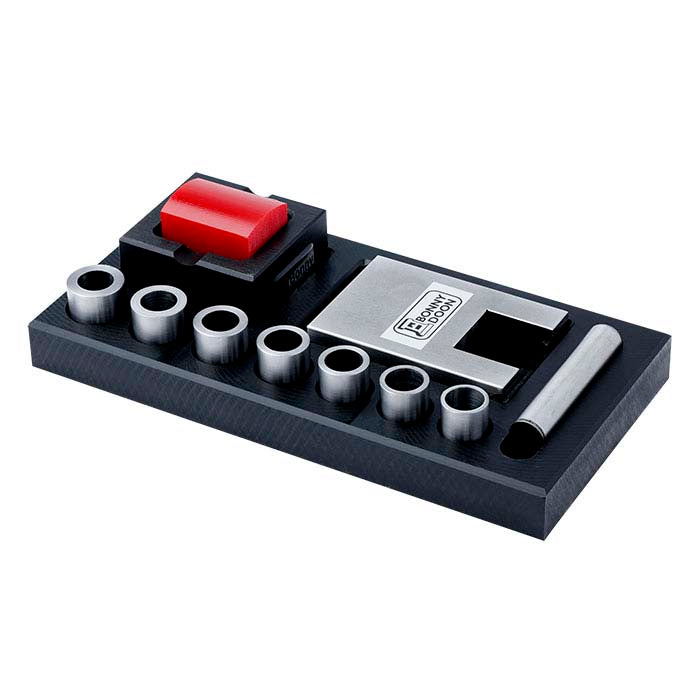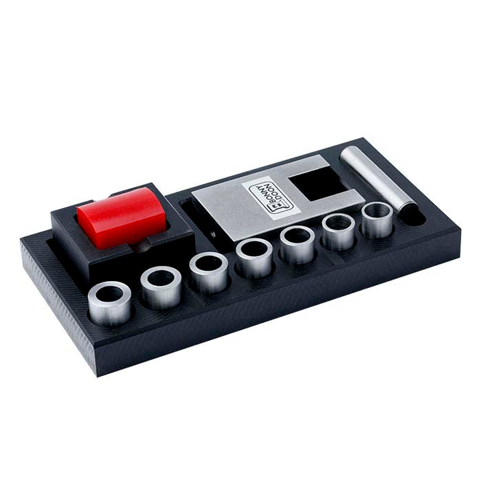 This handy kit fits into your Bonny Doon hydraulic press and enables you to perfectly shape metal to form rings and other pieces without any of the kinks, bends and marring that are part of the process when using traditional hammering techniques. The column block and bolt secure the tool to the upper platen of your press. The steel dowel holds the ring forming sleeves and attaches magnetically to the column block—easy to use and completely secure. Seven ring sleeves, all 1" long, offer diameters from 16mm to 20.5mm. The kit also includes a urethane block in a container box configured to work with the dowel and column block in shaping rings.