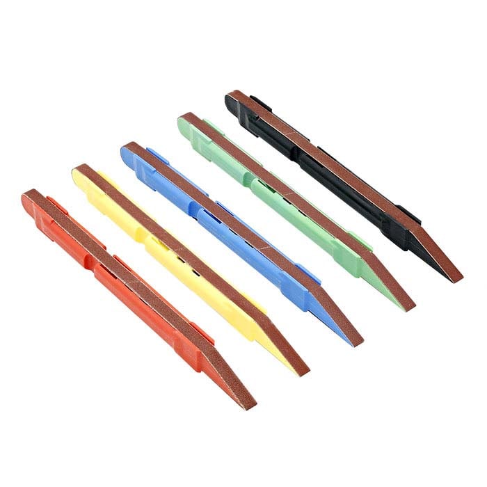 This efficient and economical set of sanding sticks includes a variety of grits, ensuring you have the grit you need when you need it; the holders are color-coded, making it easy to find the desired grit. These sanding sticks help you access small areas and allow you to easily progress through finer grits to achieve your desired finish. A replaceable belt of 3M micro-finishing paper (can be used wet or dry) is held securely in place on the plastic holder with spring tension; rotate the belts around the sticks as they wear. Replacement belts are available separately.The set includes one stick of each grit: 120-grit (red), 240-grit (blue), 320-grit (green), 400-grit (yellow) and 600-grit (black).