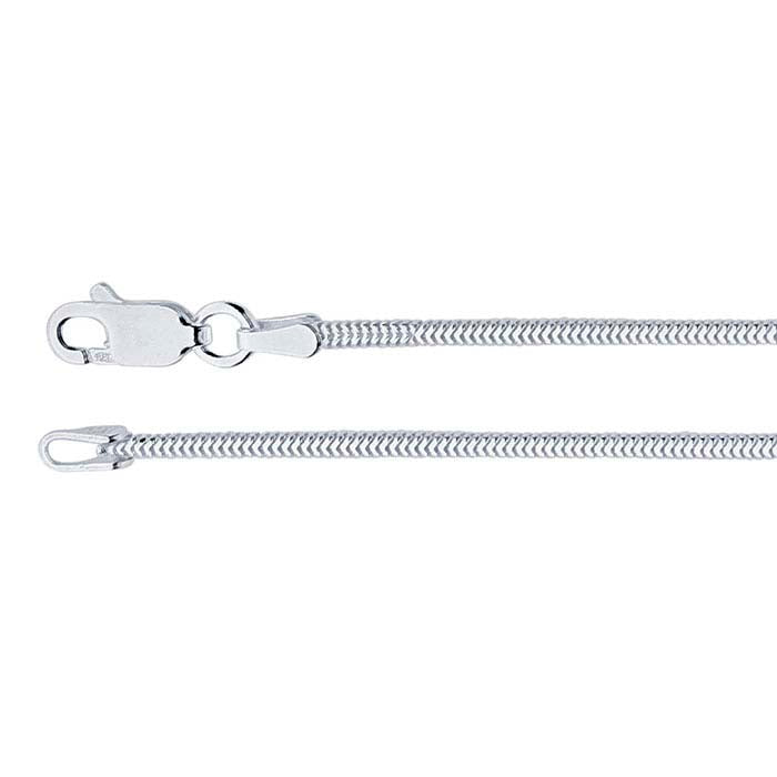 This slender round sterling silver unseamed snake chain is a great choice for designs that require sturdy support but a delicate appearance. This chain is plated with fine silver to ensure a bright white color and to help protect against tarnish.