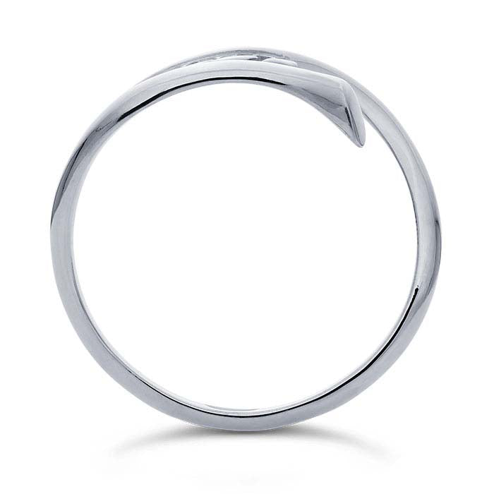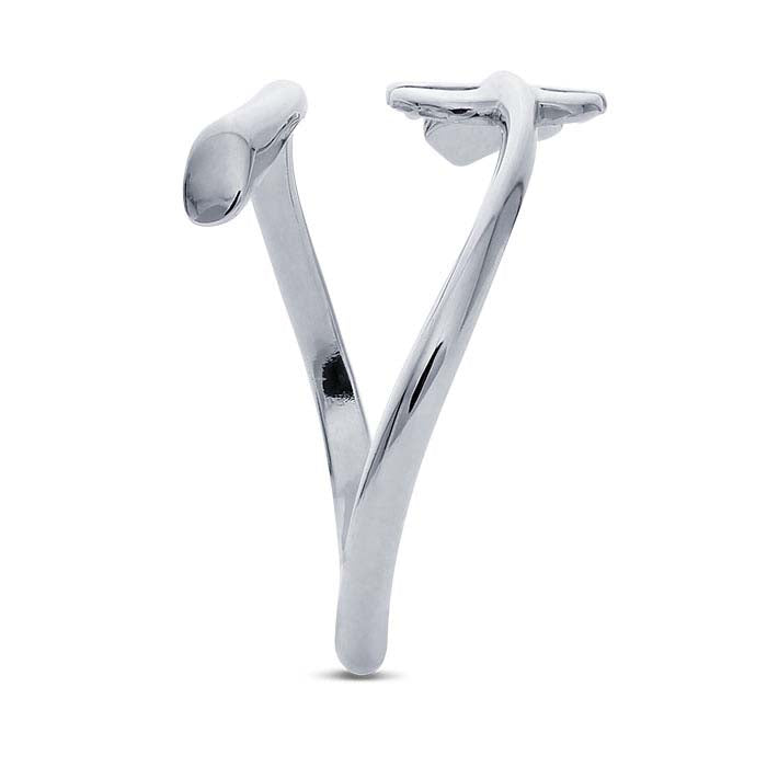 This sterling silver bypass ring features a monstera leaf on one end and has a bright finish. The bypass design creates a wrapped look and allows for small sizing adjustments.