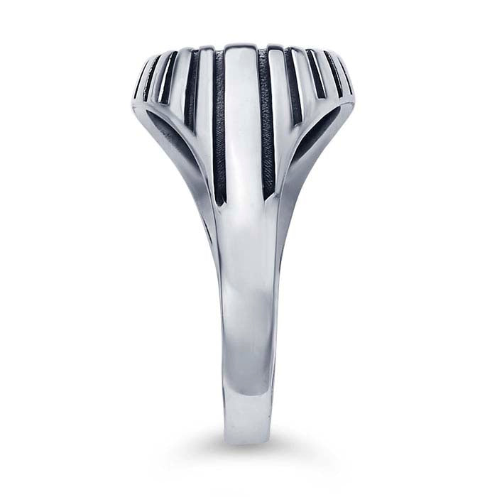 This sterling silver ring features a ridged shank rising to the open bezel mounting with a bold, oxidized finish that highlights the ridges. Set the ring with one 12 x 10mm oval cabochon using traditional setting techniques. Place your stone in the bezel and push the walls inward over the stone, holding it in place. For added security, if desired, place a drop or two of jeweler's epoxy along the rim before placing the stone.