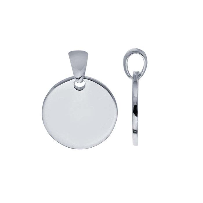 This sterling silver features pendant features a 14mm disc with a smooth, bright finish that is perfect for personalizing with a stamped or engraved detail on one or both sides. A slightly domed, tapered bail complements the pendant and allows it to be easily strung onto cord or chain.