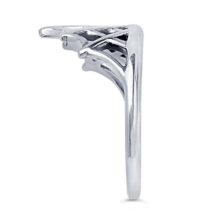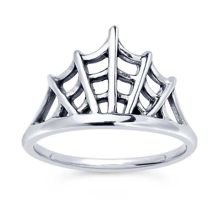 This finished sterling silver ring features an open spider web design. It looks great on its own or topping a stack.
