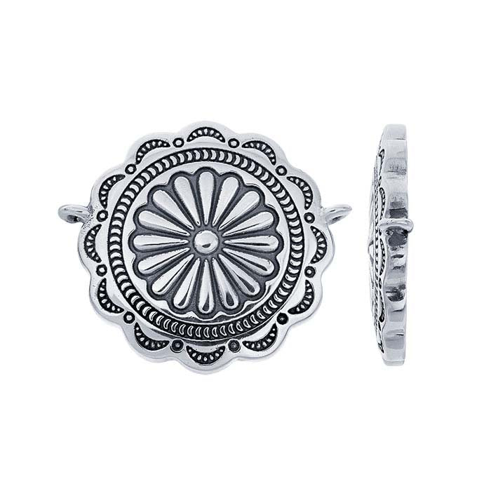 This sterling silver festoon pendant features an oval concho shape with a sunburst design and scalloped edges; it is oxidized to highlight the details. It looks great on its own or in combination with other charms and components in themed designs. Attach an individual length of chain to the fixed rings to create a simple stand-alone necklace or connect the festoon with other pendants or geometric design elements.