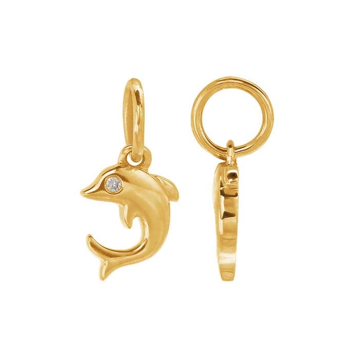 This 14-karat yellow gold dolphin charm is set with one 0.003-ct. round white diamond (SI-I1 grade/G,H,I color) as the eye. The charm is flat on the back and brightly finished on both sides. String it on a chain, connect it to bracelet, attach an ear wire, or use it as a jewelry tag or accent in a larger design.