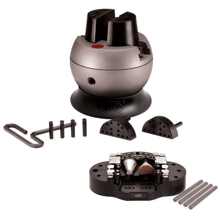 Great for your detailed engraving and stone setting tasks, the 20.9 lb. GRS® standard engraving block allows you to access your work from almost any angle. A ball and roller system ensures smooth rotation and prevents internal wear. The adjustable rotational brake allows the ball to rotate freely for positioning or be secured in place while you work. The crown and base are machined from solid stainless steel and finished with a special low-glare treatment to reduce eye strain. Block includes upper jaw plates, four pins, base and a wrench. Microscopic Work   The standard engraving block is ideal for exacting tasks with the aid of a microscope. The vise configuration allows quick and easy positioning adjustment of your piece without changing the alignment of the microscope or its field of view. You can even adjust it without taking your eyes from the microscope.  GRS® 520 Accessory Set This accessory set allows you to hold virtually any piece in the GRS® standard engraving block while you work. All components are organized in an easily accessible organizer tray made of high-impact plastic molded to accommodate each component. Includes: