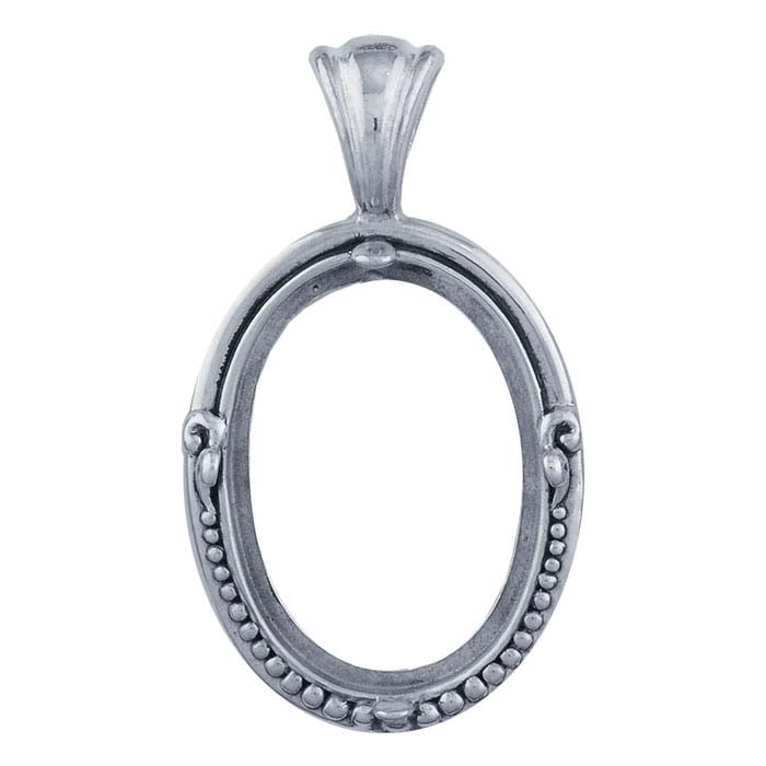 This sterling silver pendant mounting holds one 25 x 18mm oval cabochon in a 4-prong mounting. It features a graduated beaded design on the bottom half of the pendant and a fluted tapered bail that complements the design of the mounting. The mounting has a flat, open base; the open back makes it lightweight and comfortable to wear. The pendant has a bright finish; leave it bright, or oxidize the pendant to bring out the details.