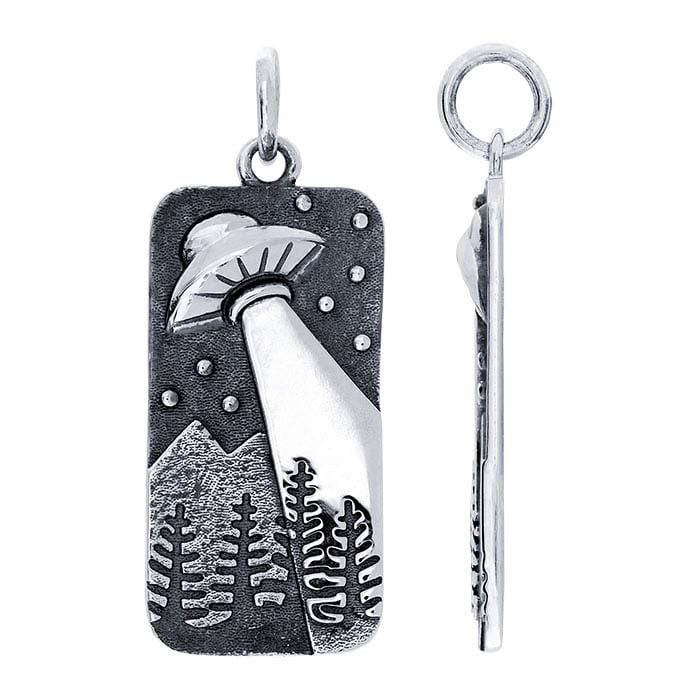 This rectangle sterling silver pendant features a UFO with light shining down on mountains and trees in front of a star-filled sky, oxidized to highlight the brightly finished UFO on a dark background. Create a necklace, or combine it with other charms and components in a more complex design. The pendant includes a jump ring.